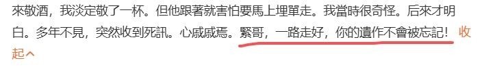 20. 过去无论是合作期间还是争执时刻,王晶通常直呼其名或昵称“阿紧”,而此次文末却以“紧哥,一路走好”收尾,语气中透出久违的温情与亲近。