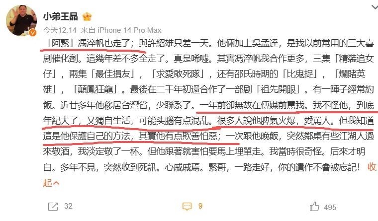 13. 谁料11月1日中午,王晶亲自发布一篇长文悼念,字里行间流露出深沉感慨,读来令人百感交集。